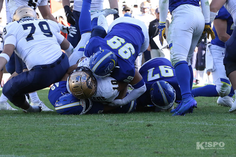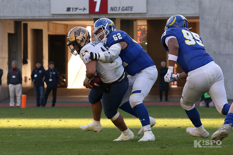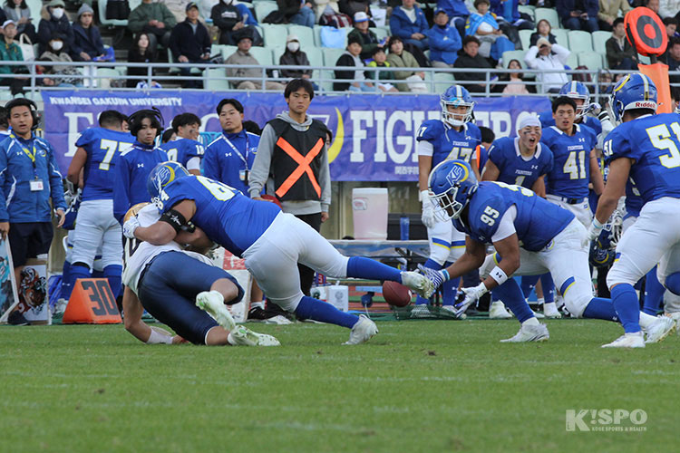 さらに試合終盤には、この日関学にとって7個目のQBサックとなる4回生DL小川晃弘選手のタックルが決まると、ファンブルしたボールを4回生DL新井イケンナ望在選手がリカバー。