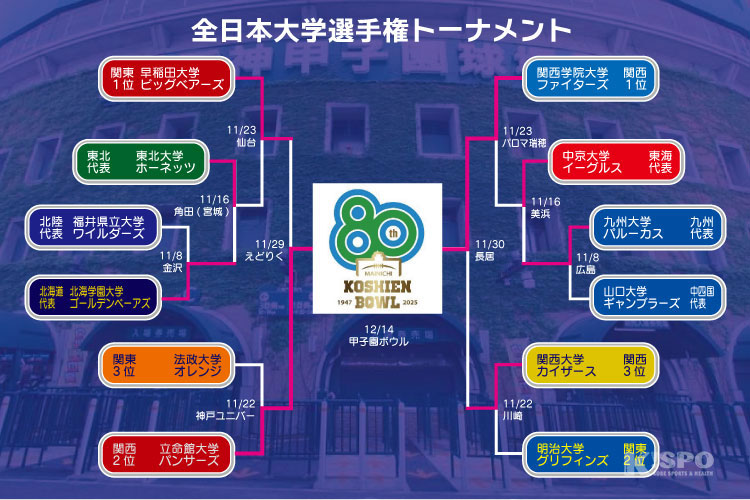 昨シーズンから、関東・関西各リーグの上位チームに全国の地域代表校が加わる形式となり、今年は関西学院大学と立命館大学という関西の2校が甲子園ボウルを戦うことになりました!