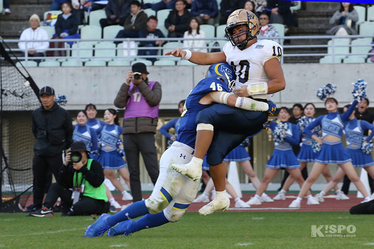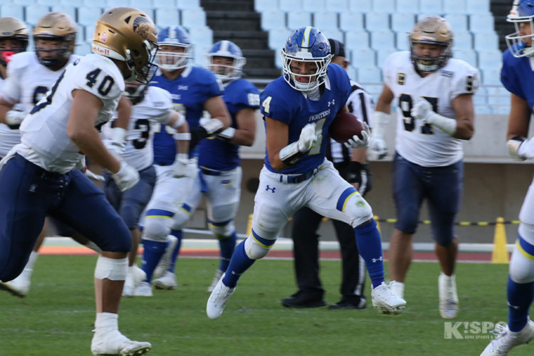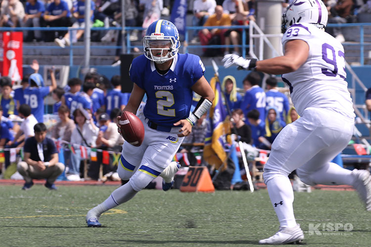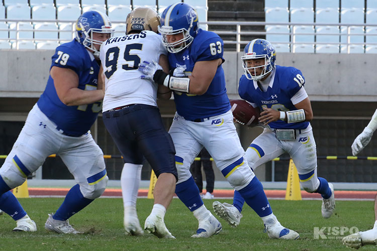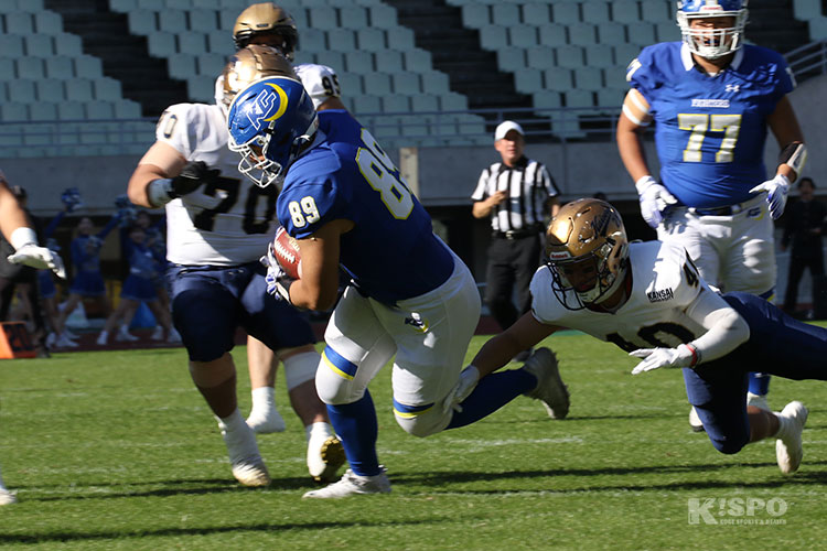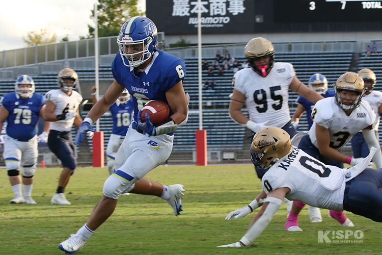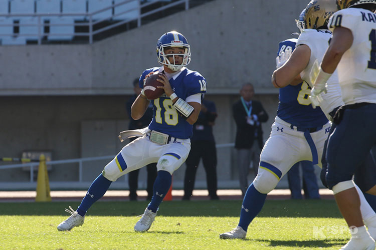高いアメフトIQでパスとランをバランスよく繰り出していきますが、とりわけ足にも自信がある太吾選手は、自分のランでゲインを稼ぐこともできる選手。