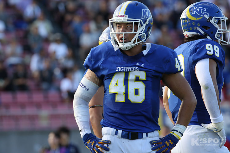 ディフェンスの中軸を担うのが、LB(ラインバッカー)の4回生大竹皓陽選手(背番号46)と3回生の倉田我琉選手(背番号41)。