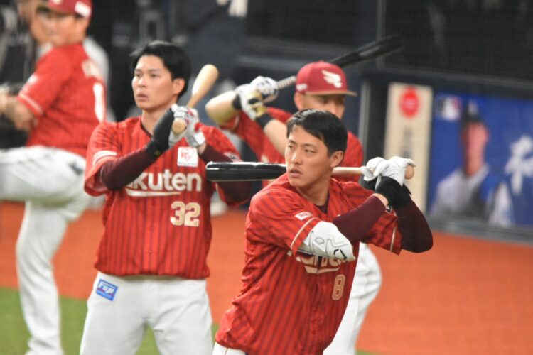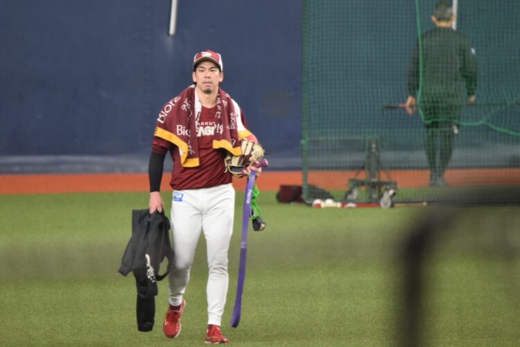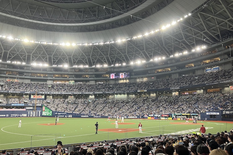 さて。席についてみると、楽天イーグルスが練習中。あ!あの人がいる!あの人もいる!ビジターユニ、色目が明るくなって線(東北ストライプというらしい)入ってるし。