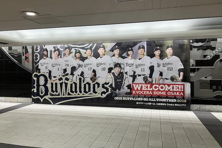 あれよいやよというとる間に、2026年シーズンもいよいよ開幕。今年は開幕戦観察や!と多くのファンとともに地下鉄ドーム前千代崎駅を降りると、新しい看板がWELCOMEとお出迎え。