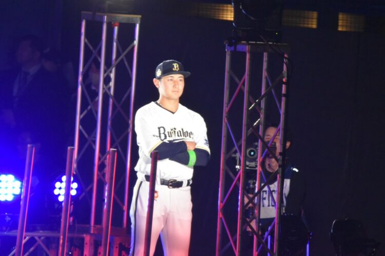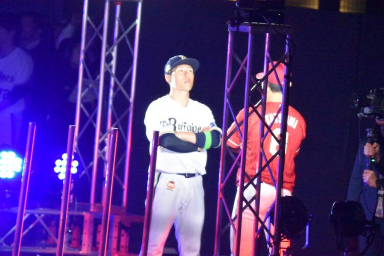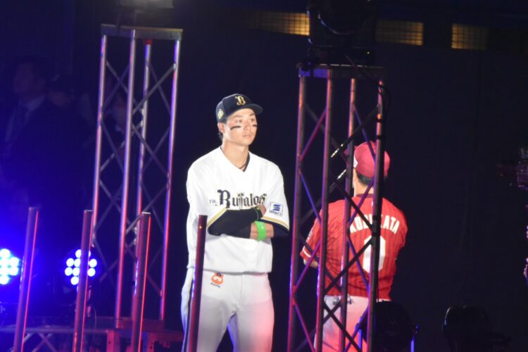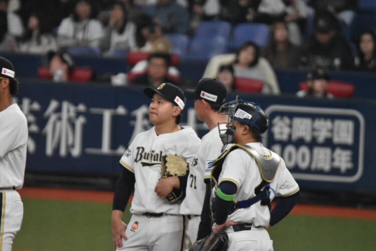 両チームのシートノックをたっぷり見たあとは、人件費たんまりかかってそうな壮大な開幕セレモニーが行われ、球場は高揚感に包まれる(高揚感… ここまでは)。んが。スタメン打順で敵味方にらみ合う演出は、どうなん? つまらんテレビのバラエティを思わせるし、辰巳は西川を笑かせにかかるし、相手がブルペンにいる紅林は一人で呆然とするし(笑)。
