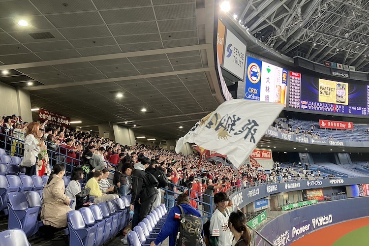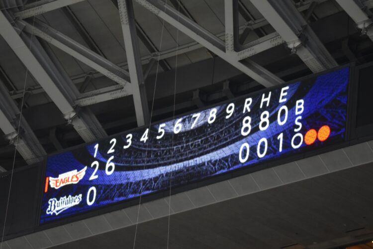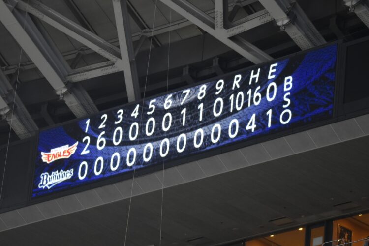 いざ試合が始まると、いきなりエース宮城が楽天打線につかまり、なんと2回表でこのスコアで降板。楽天の連打連打に、オリッファンは「ひい」より小さく「ひ」と小さく叫ぶのみ。セレモニーのテンションと試合内容のギャップに場内ひんやりして、鼻水が「つー」。