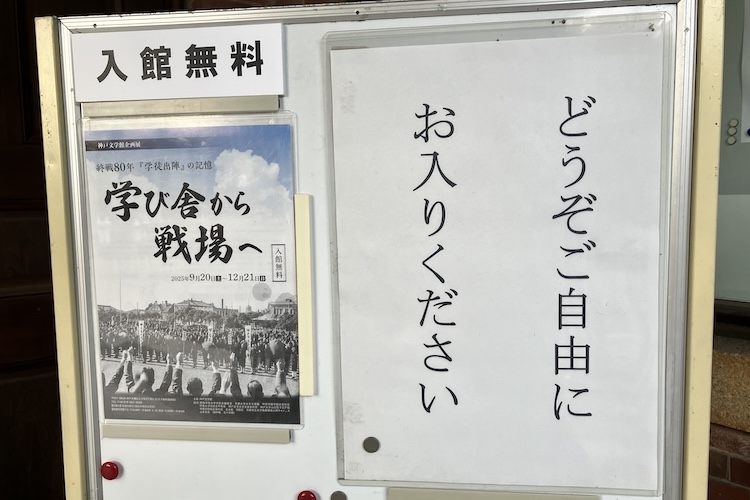俳人の山口誓子が、当時の神戸商業大学から出征した義弟を詠んだ句や書簡、入隊した学生が戦死直前まで書き続けた日記、寄せ書きされた日の丸なども展示されています。