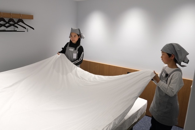 ホテルパビリオンで体験できるのは「ホテリエ」と「メイクスタッフ」。フロントでのチェックイン作業やベッドメイキングのおしごとが体験できます。