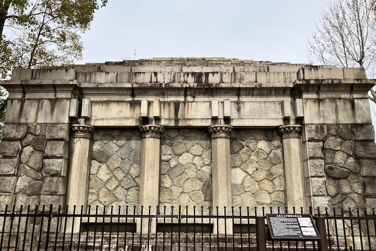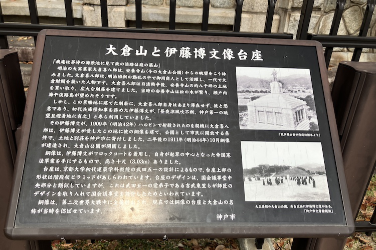 すると、石垣に見えたのは、初代兵庫県知事、伊藤博文像…の台座でした。